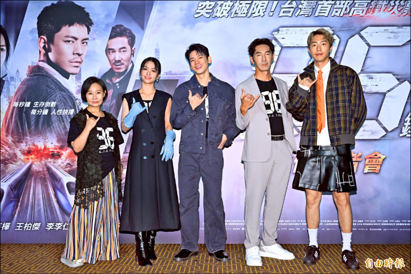 電影《96分鐘》的演員呂雪鳳(左起)、宋芸樺、林柏宏、李李仁、蔡凡熙昨天宣布票房突破1.1億,成為今年第二部票房破億國片。(記者胡舜翔攝)