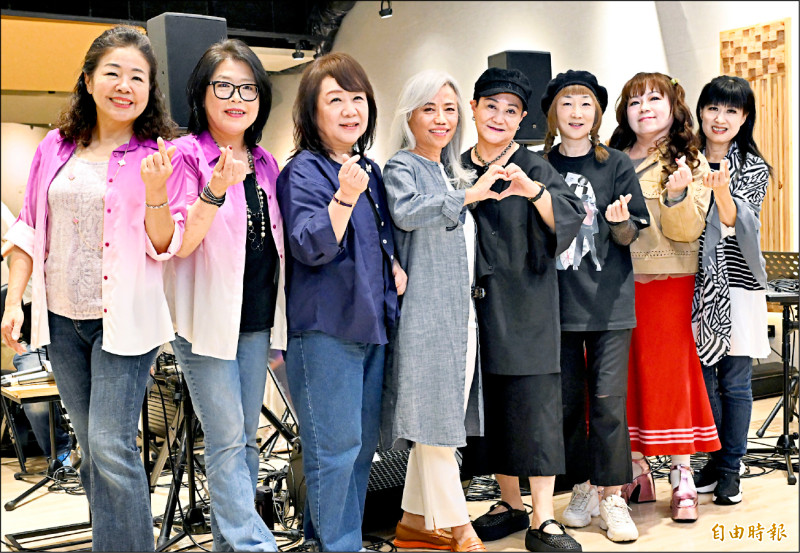 許淑絹(左起)、林佳蓉、徐曉菁、楊芳儀、邰肇玫、陳艾玲、南方二重唱齊聚為大巨蛋民歌演唱會彩排。(記者胡舜翔攝)