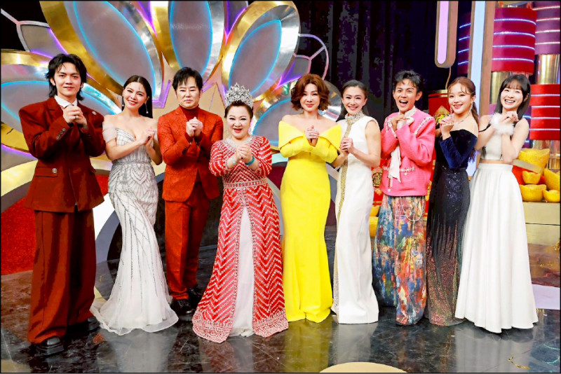 民視除夕節目《民視第一發發發》由郭忠祐(左起)、白家綺、陽帆 、白冰冰 、陳美鳳 、侯怡君 、阿翔 、賴慧如 、籃籃共同主持。(民視提供)