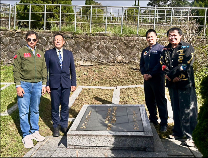 異域故事館董事長王根深(左起)、孤軍後代王紹章、國軍心輔講師黃信凱及YouTuber司徒建銘祭拜柯俊雄原型李國輝團長長眠處。(王紹章會長提供)