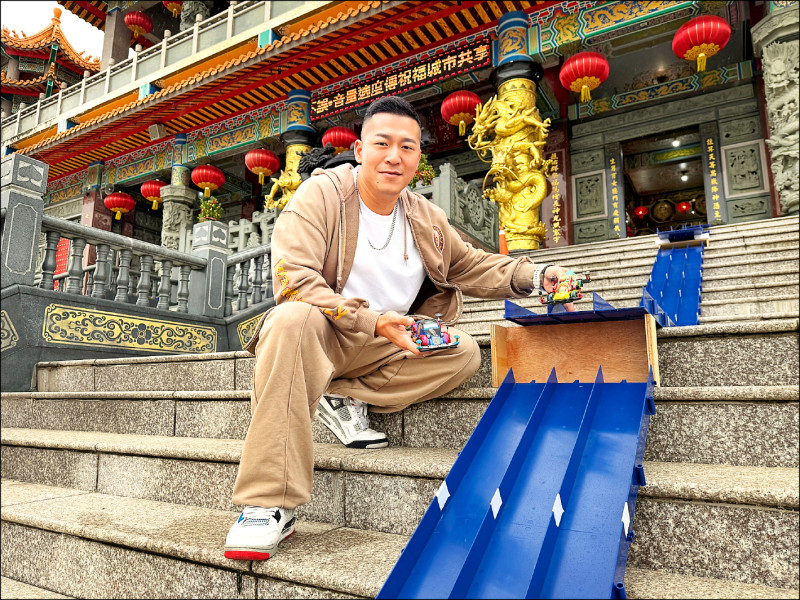 草爺將四驅車軌道安置於廟埕、登殿階梯、龍柱、石獅等處。(紅心字會提供)