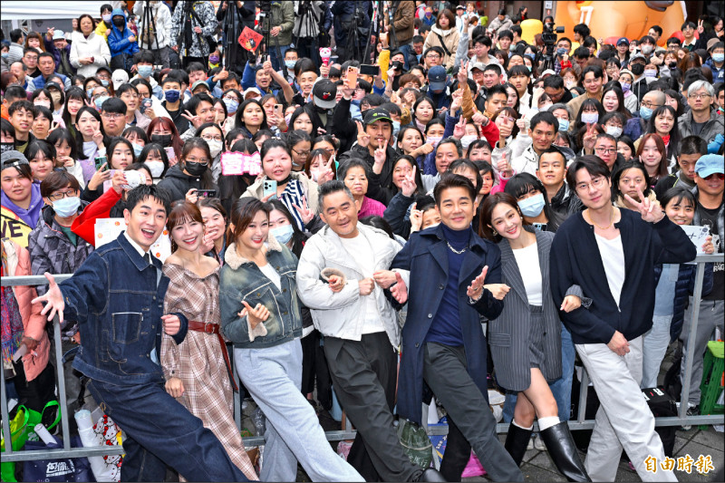 陳謙文(前排左起)、林萱瑜、陳珮騏、江國賓、謝承均、邱子芯和劉書宏昨在熱鬧的大稻埕,和近千位粉絲相見歡。