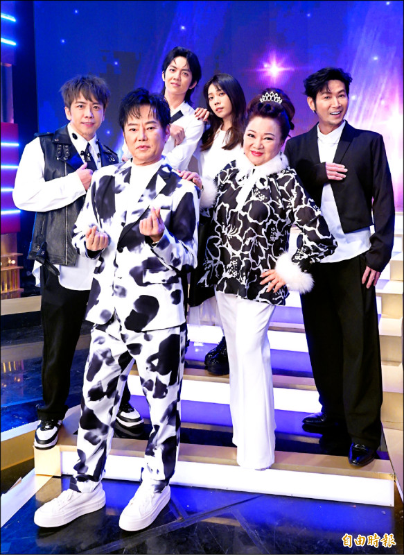 陽帆(前排左)、白冰冰帶領子弟兵東諺(後排左起)、郭忠祐、蔡家蓁、阿玟主持民視《超級冰冰Show》。(記者潘少棠攝)