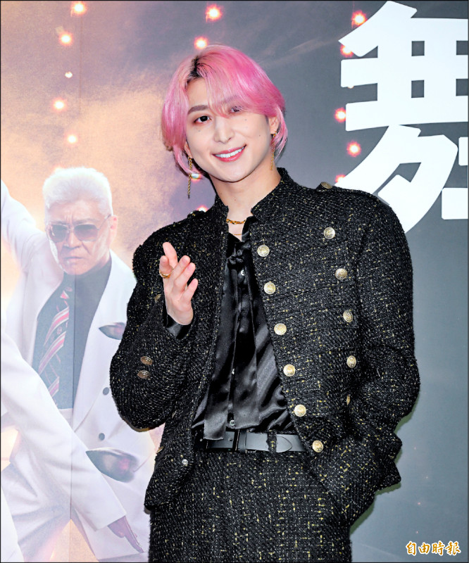 佐久間大介昨天頂著招牌粉色頭現身記者會,活潑表演帥氣開槍。(記者王文麟攝)