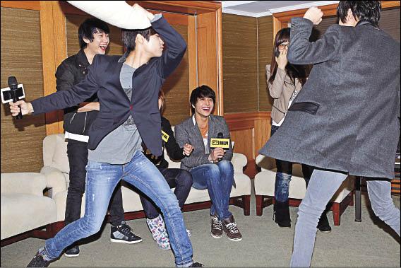 承炫(右)偷爆料在真(左)的糗事,被他拿抱枕猛K,相當搞笑。(圖文/記者王文麟)記者鄭宜熏/台北報導