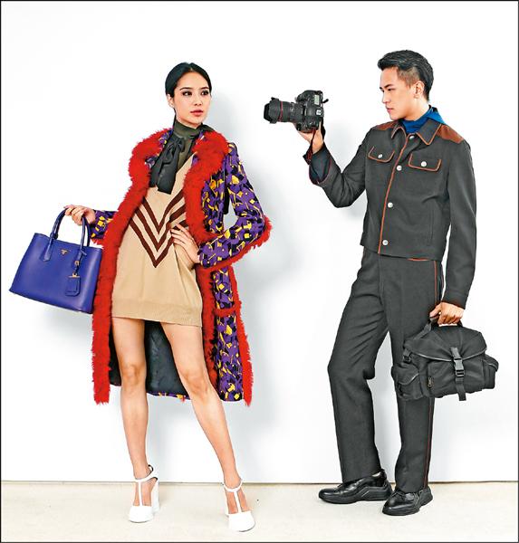 白歆惠詮釋Prada本季受到舞蹈劇場啟發的設計,外套,243,000元;針織衫,38,500元;絲巾,8,000元;包款,88,500元。男模展示外套,90,000元;長褲,27,500元;絲巾,8,000元。(圖文:記者胡舜翔)